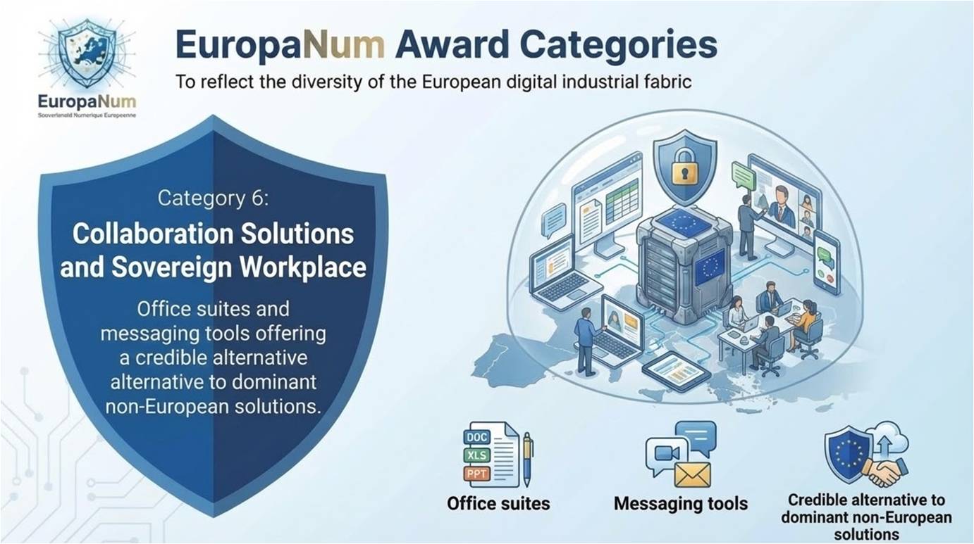 This category recognizes office suites, messaging tools, and collaborative work platforms that offer a credible alternative to dominant non-European solutions. Key criteria include the protection of metadata, the integration of trust services, and the ease of deployment within large organizations.