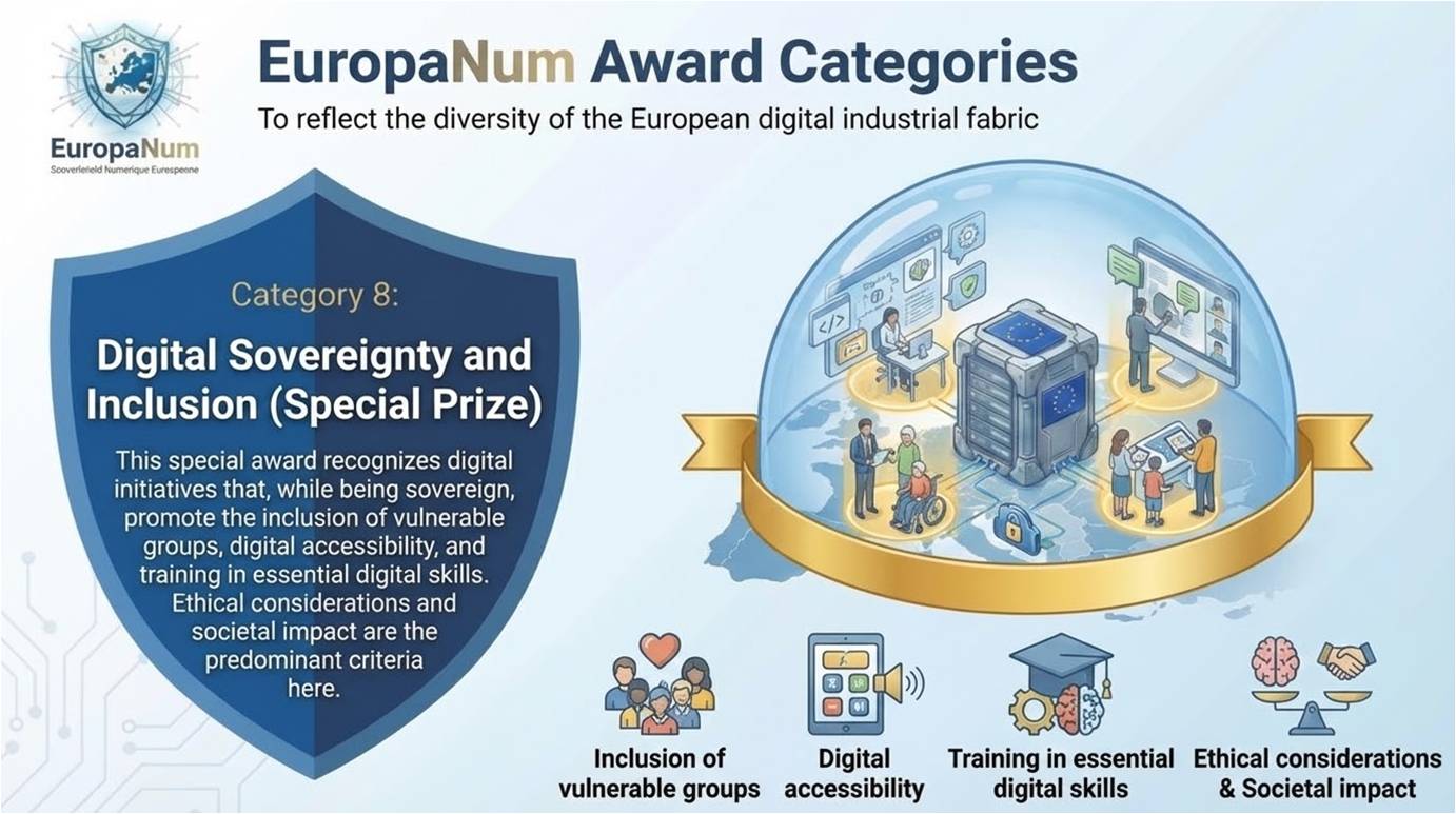 This special award recognizes digital initiatives that, while ensuring sovereignty, promote the inclusion of vulnerable groups, digital accessibility, and training in essential digital skills. Ethical considerations and societal impact are the prevailing criteria for this category.